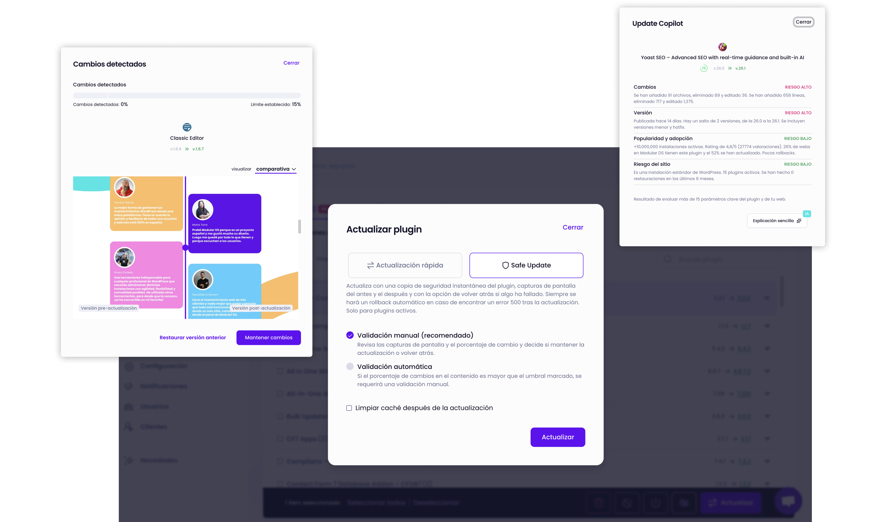 Desde backups hasta reportes para clientes. Con Modular DS tienes todo lo que necesitas para gestionar múltiples webs de WordPress de forma fácil y eficiente.