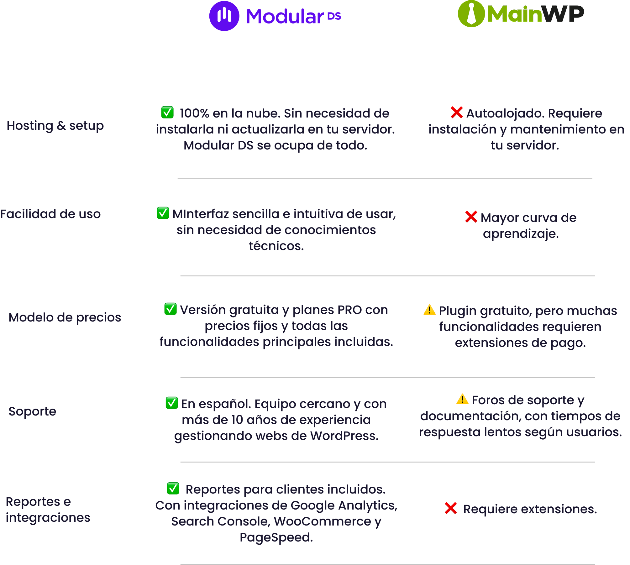 Diferencias entre Modular DS y MainWP de un vistazo