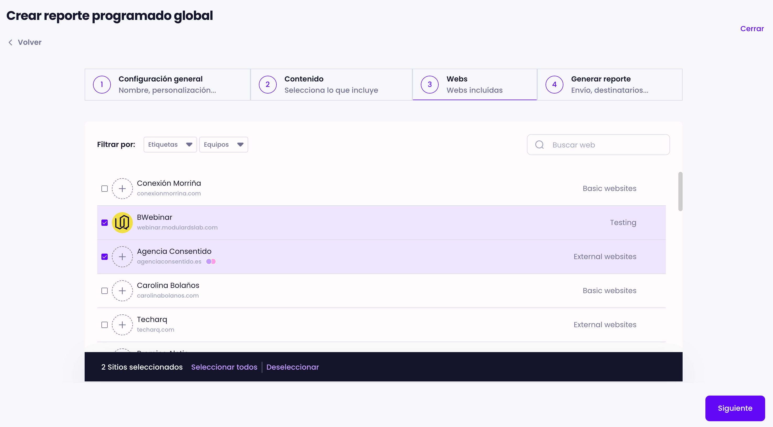 Con los nuevos reportes globales, puedes crear y programar un solo reporte para múltiples webs a la vez, ya sea de forma puntual o recurrente.