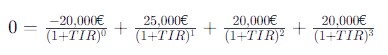 - The cash flows are: -€20,000 (initial investment), +€25,000, +€20,000, +€20,000 for each of the three years.