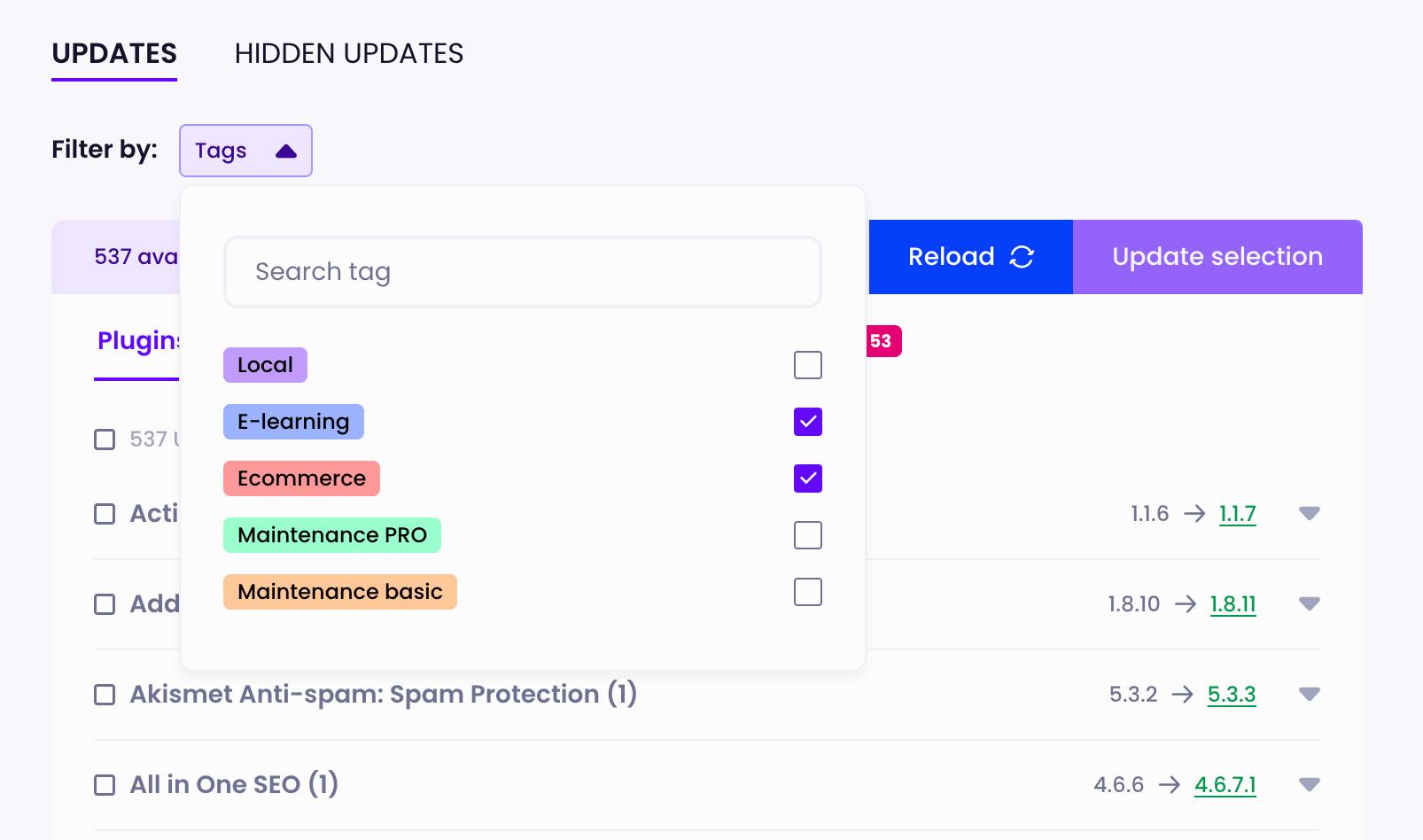 Do you need to update only e-commerce sites or projects for a particular client? Just tag them, filter, and update. It’s that simple.
